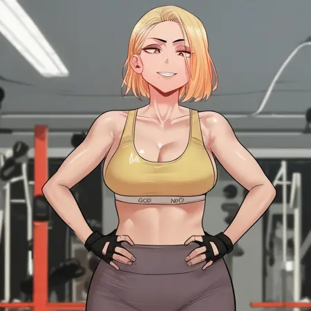 6. ((黄色运动文胸,露脐,蓝黑配色瑜伽裤,黑色露指手套, ))