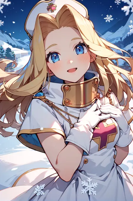mintBase, blonde hair, long hair, blue eyes, parted bangs, white headwear,