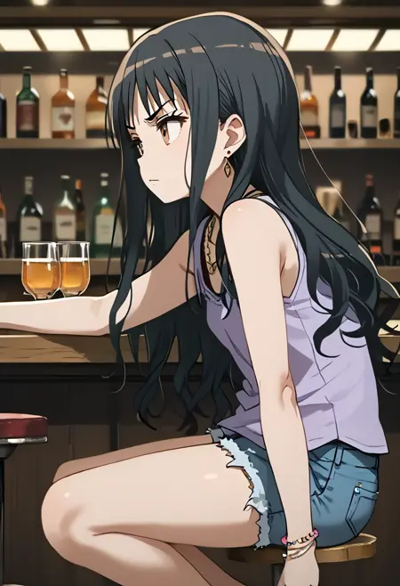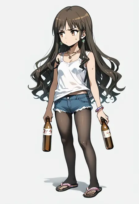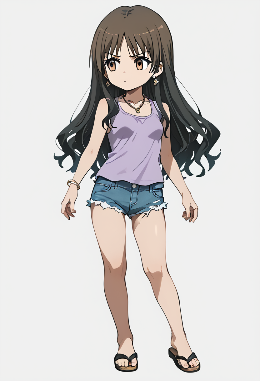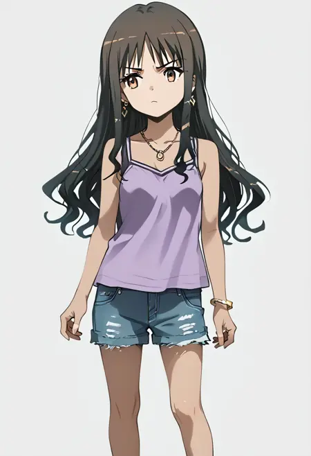 yukiko kanzaki,gyaru,brown eyes,[black:brown:10] hair,long hair,wavy hair,bangs,small breasts,black sleeveless_shirt,cutoffs,barefoot_sandals,jewelry,earrings,necklace,serious,