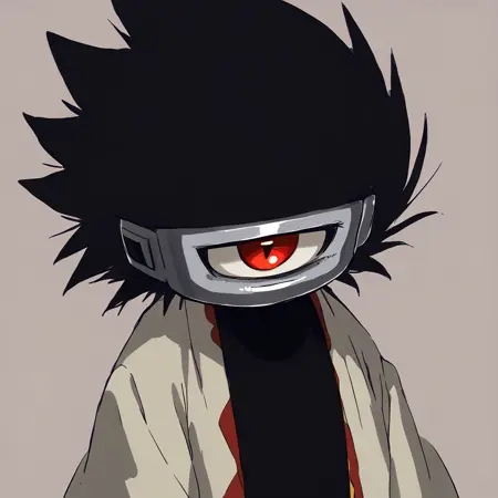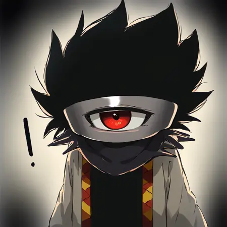 red eyes, black hair, no humans, spiked hair, one-eyed, pauldrons