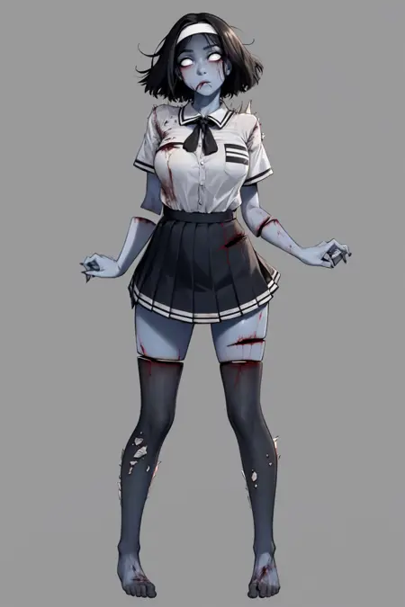 女学生提示词:1girl, spdbdl, 黑色头发, 短发, 白色眼睛, 无瞳孔, 蓝色皮肤, 发带, 百褶裙, 校服, 白色衬衫, 黑色过膝袜, 破损衣物, 衣物上有血迹, 赤脚