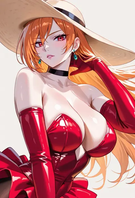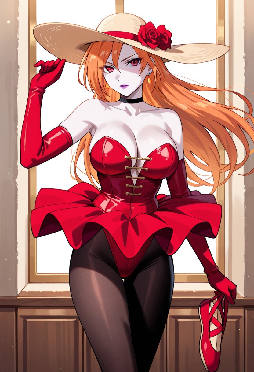 primarda, primarda_human,long hair, 1girl, solo, red eyes, breasts, orange hair, pale skin, large breasts, gloves, ballet slippers, hat, sun hat, pantyhose, earrings, choker, elbow gloves, strapless , jewelry, red gloves, cleavage, bare shoulders, ballet skirt,