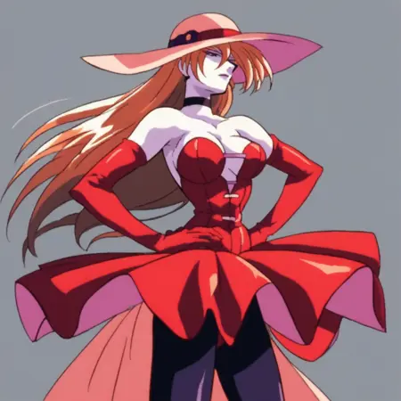primarda, primarda_human,long hair, 1girl, solo, red eyes, breasts, orange hair, pale skin, large breasts, gloves, ballet slippers, hat, sun hat, pantyhose, earrings, choker, elbow gloves, strapless , jewelry, red gloves, cleavage, bare shoulders, ballet skirt,