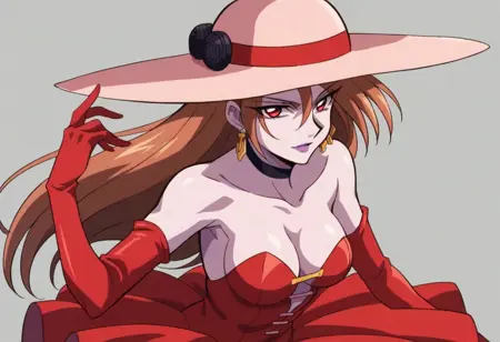 primarda, primarda_human,long hair, 1girl, solo, red eyes, breasts, orange hair, pale skin, large breasts, gloves, ballet slippers, hat, sun hat, pantyhose, earrings, choker, elbow gloves, strapless , jewelry, red gloves, cleavage, bare shoulders, ballet skirt,