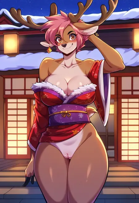 dazzlerxl,deer, deer antlers,pink hair ,short hair, pink eye makeup, brown eyes, big breasts, big ass,