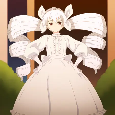 提示: futaba yozakura, futabas clothing, headband, white hair, twin drill hair, white gloves,