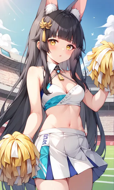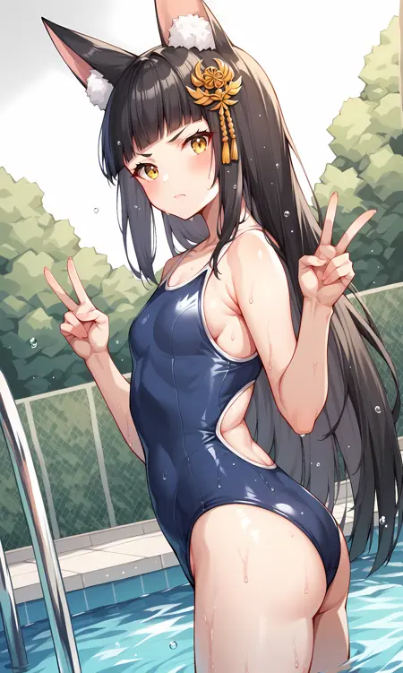 외모: 나가토, 노랑색 눈, 검은색 머리, 매우 긴 머리, 둔한 앞머리, 옆머리, 여우 귀