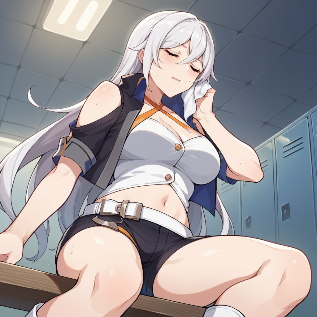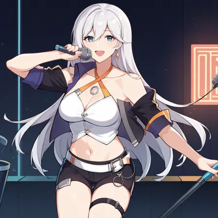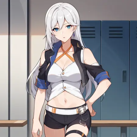 Cecil_Idol、白いシャツ、腹出し、へそ、短めのジャケット、黒いジャケット、短い袖、肩抜き、白いベルト、黒いショートパンツ、短いショートパンツ、太ももストラップ、裸の肩、鎖骨、胸元、ハーネック、