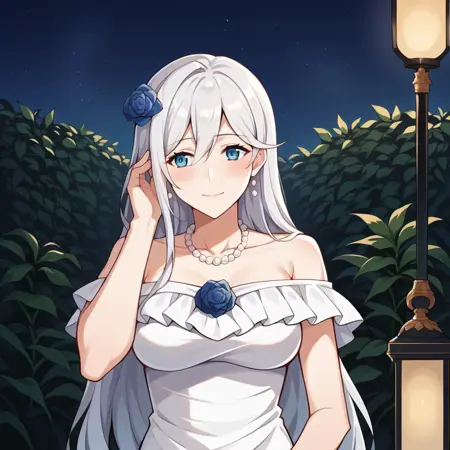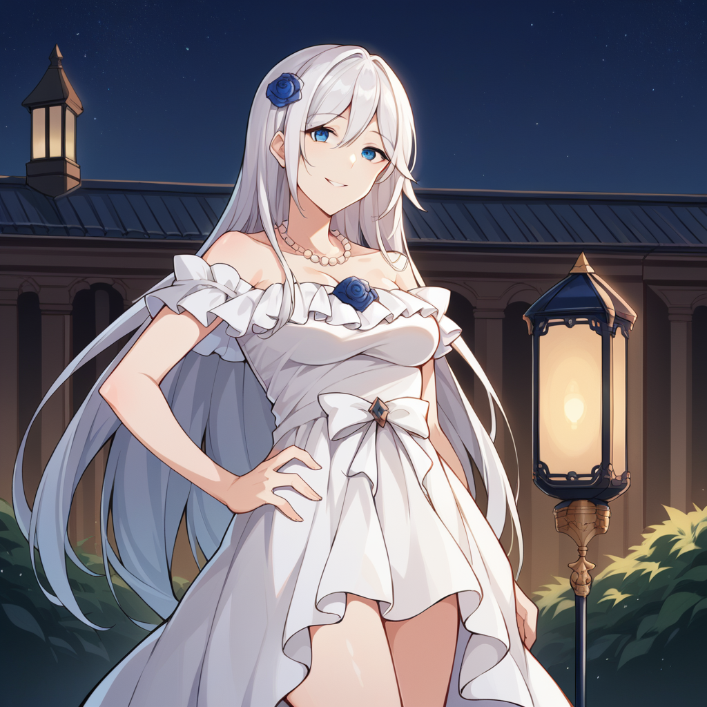 Cecil_White、白いドレス、ストラップレスドレス、フリル、オフショルダードレス、白いリボン、フリルスカート、裸の肩、髪の花、青い薔薇、真珠のネックレス、裸の脚、