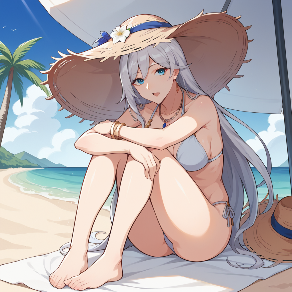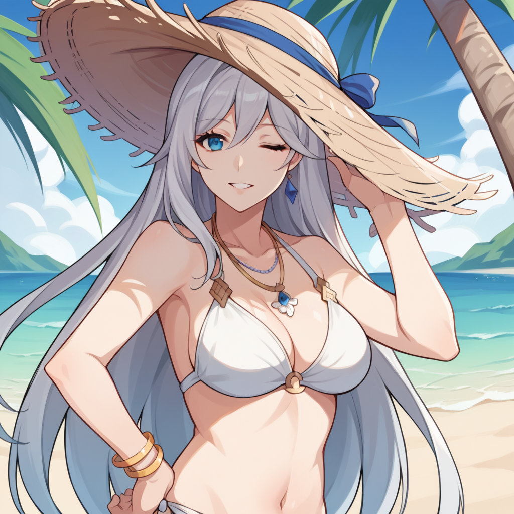 Cecil_Swimsuit、白いビキニ、ストリングビキニ、わら帽子、ネックレス、ブレスレット、帽子の花、