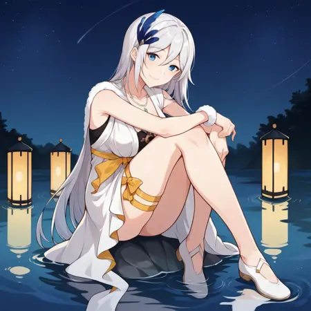 Cecil_Moon、白いドレス、髪飾り、ノースリーブドレス、太ももストラップ、白いフェザーボア、黄色いリボン、ネックレス、鎖骨、胸元、
