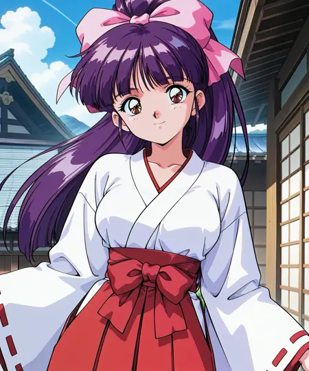 purple hair,long hair,hair bow,ponytail,nipples,breasts,brown eyes,medium breasts,