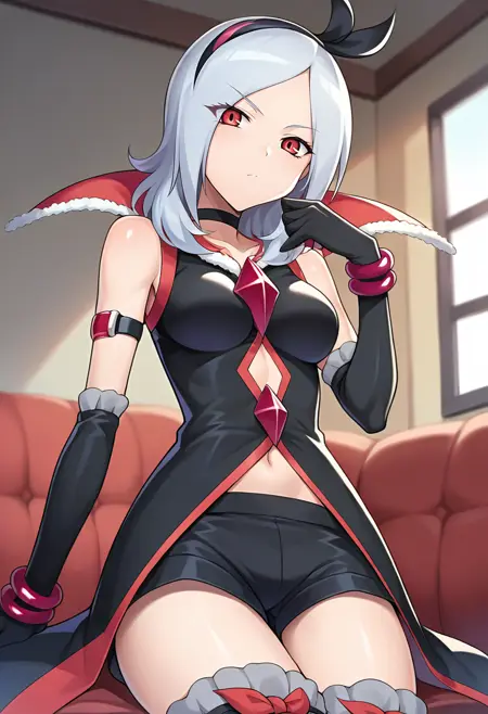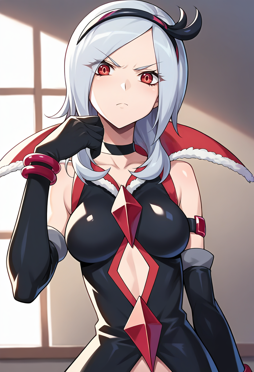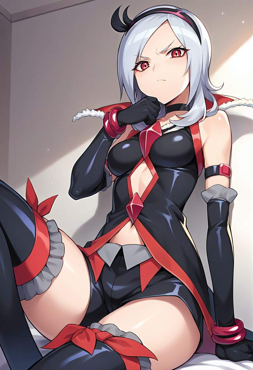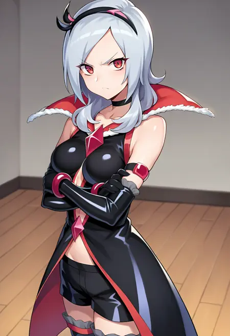 의상 1 Eas: 빨간 눈, 회색 머리, 헤어밴드, 검은 초커, 검은 드레스, 플로팅 칼라, 팔꿈치 장갑, 팔찌, 팔착, 검은 반바지, 프릴 허벅지 스타킹, 의상 컷아웃,