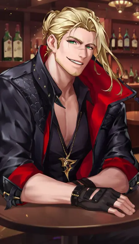 DonaldPTN, 녹색 눈, 금발, 긴 머리, 낮은 포니테일, 콧날 흉터, 안면 털, 긴 검은 재킷, 빨간 안감, 검은 셔츠, 검은 바지, 유틸리티 벨트, 무릎 위 부츠, 손가락 없는 장갑, 선글라스, 금빛 펜던트, 목걸이