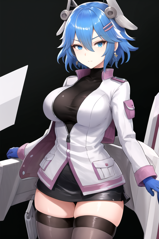 S4ndGirlLO, 1girl, solo, short hair, blue eyes, large breasts, hair ornament, grey thighhighs, blue gloves, hair between eyes, blue hair, headgear, white jacket