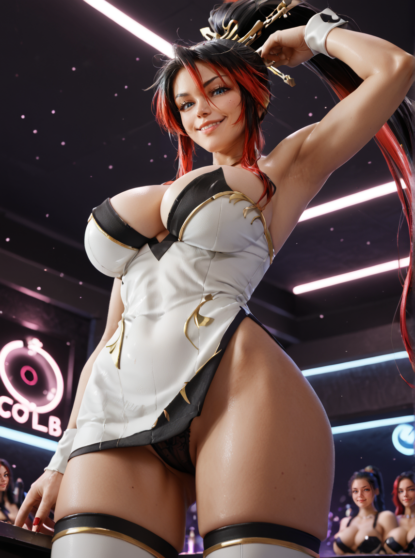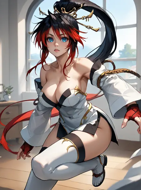 Kaguya, long hair, ponytail, multicolored hair, black hair, red hair, blue eyes, huge breasts, white clothes with black details