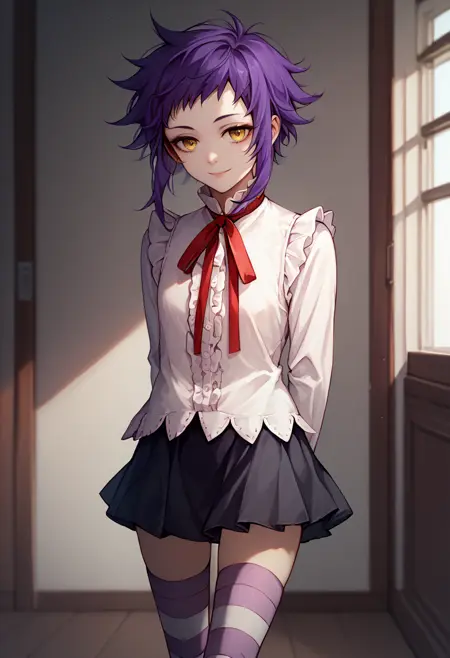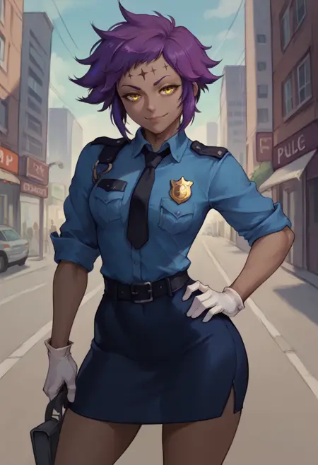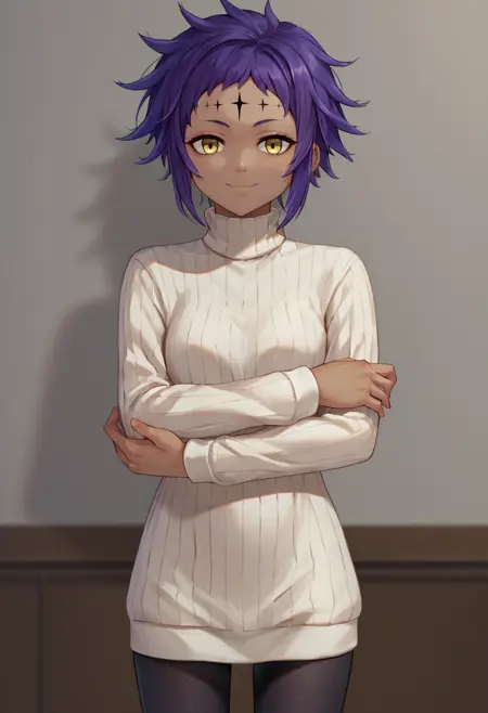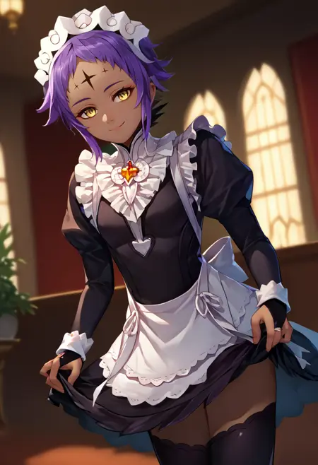 트리거 + 노아 외모: roadkamelot, dark skin, facial mark, purple hair, yellow eyes
