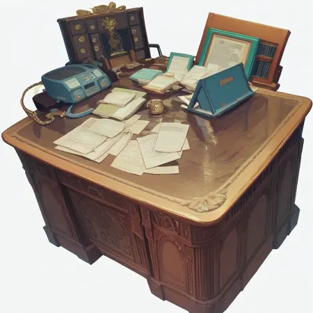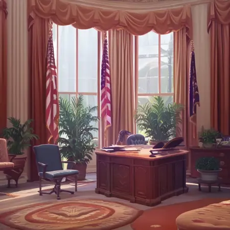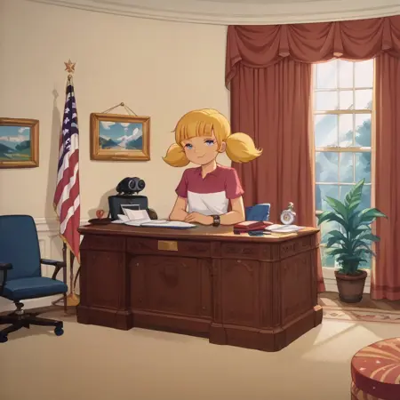 提示词:oval_office, resolute_desk。建议使用“photograph, photo (medium), realistic”作为负面标签。已标记的辅助元素包括:desk, curtains, window, flag, plant, potted plant, indoors, carpet, flag, American flag, chair。年代也已标记(例如1990s),但我怀疑在如此有限的数据下这可能无关紧要。