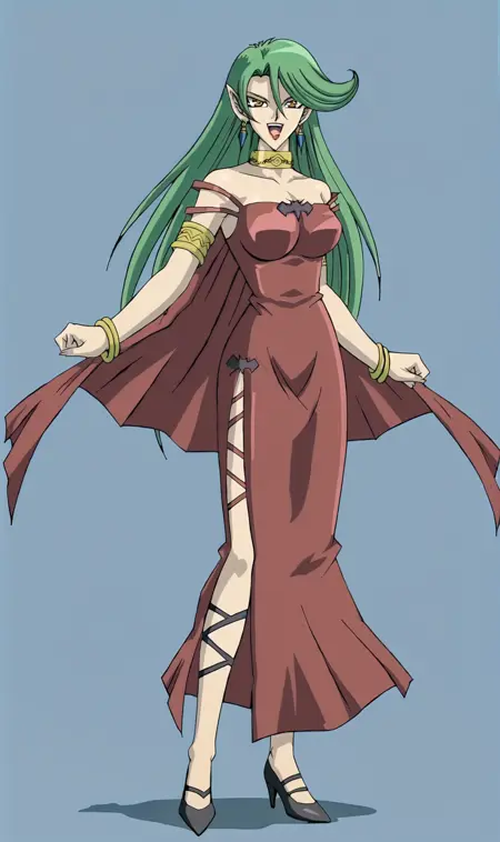 服装1 - '红色连衣裙,吊带裙,耳环,臂环,金项圈,裙摆开衩,手镯,细带高跟鞋' 开衩和高跟鞋上的 straps 为随机出现,因此不要期待过于精确的效果。