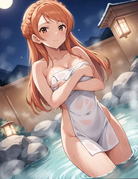 외모: hojo karen, 1girl, 긴 머리, 주황색 머리, 크라운 땋은 머리, 흘린 앞머리, 갈색 눈