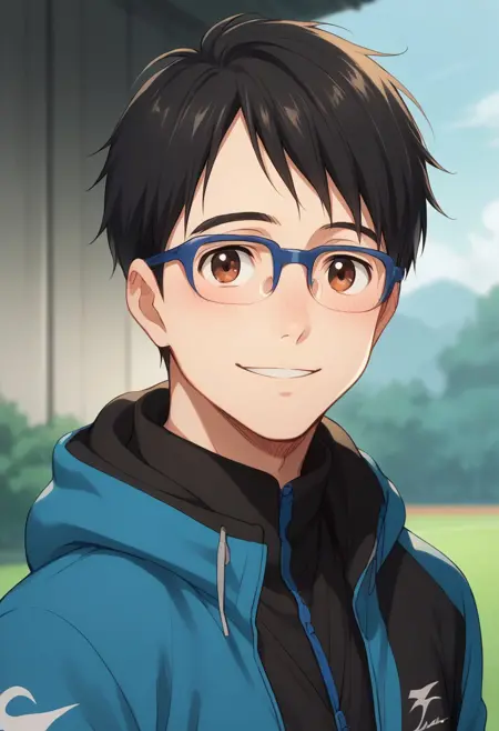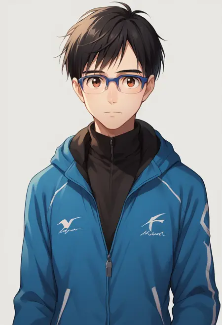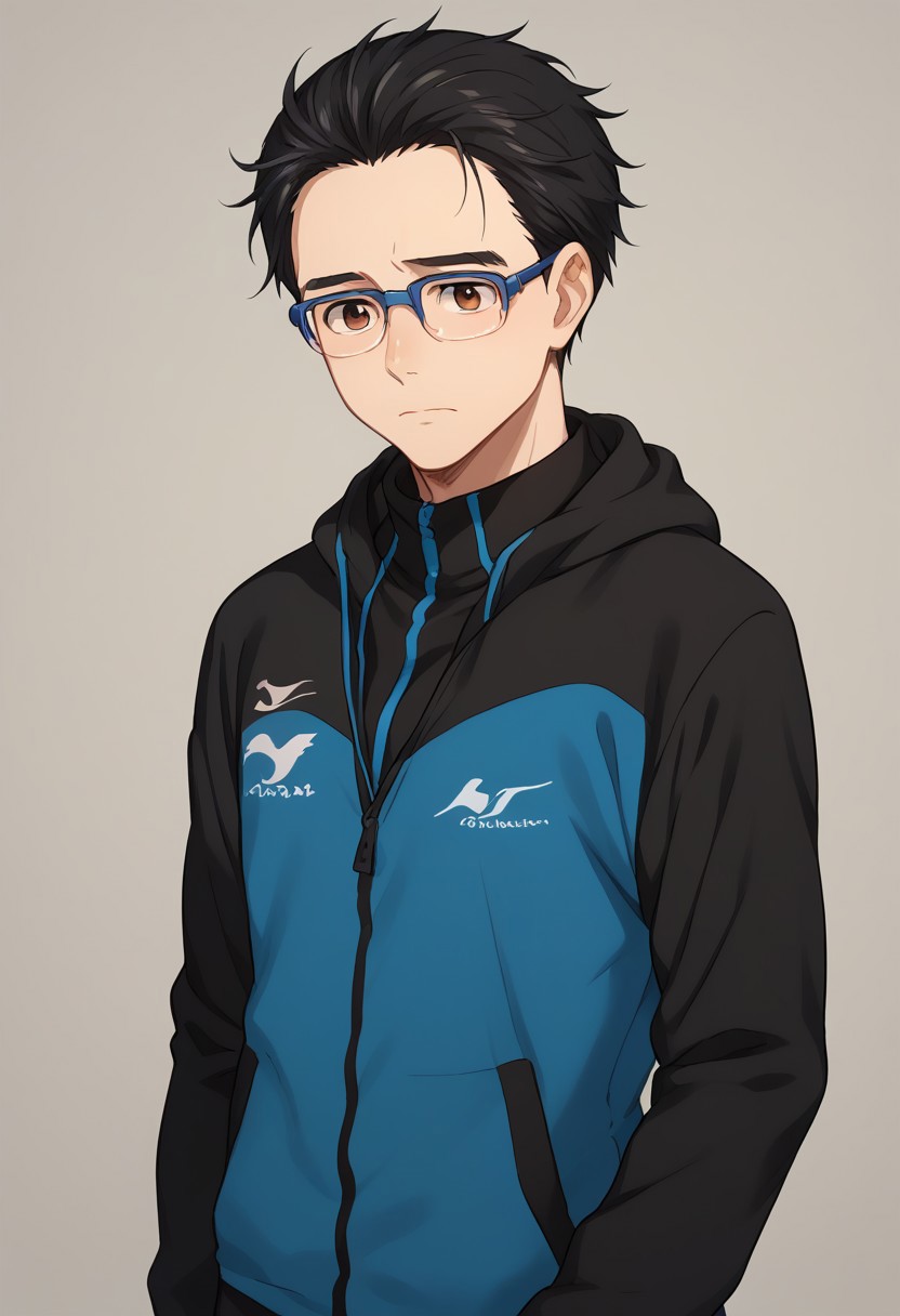 yurikatsuki, 1boy, male focus, glasses, black hair, blue-framed eyewear, jacket, brown eyes, track jacket, turtleneck,