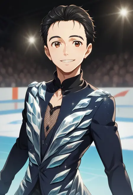 yurikatsuki,1boy, skates, ice skates, male focus, black hair, hair slicked back, brown eyes, ice-skating uniform,