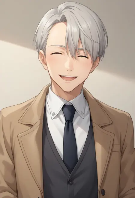 viktornikiforov, 1boy, male focus, closed eyes, necktie, open mouth, smile, grey hair, ^ ^, coat, vest, shirt, white shirt, belt, pants