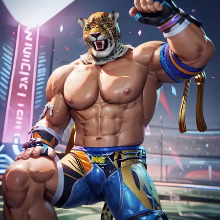 king_tekken, man, King from Tekken 7, fully body, wrestling outfit, bare chest, yellow and blue pants, yellow boots, yellow knee pads, yellow and blue fingerless gloves, yellow elbow pads, tail, bara