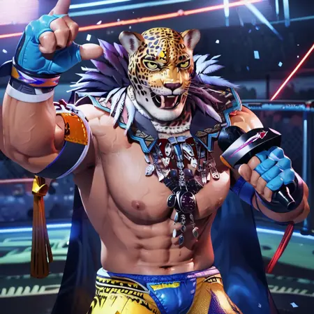 king_tekken, King from Tekken 8, man, full body, wrestling outfit, bare chest, blue cape, necklace, purple feathers, yellow and black pants, yellow and blue boots, knee pads, black and blue fingerless gloves, bara