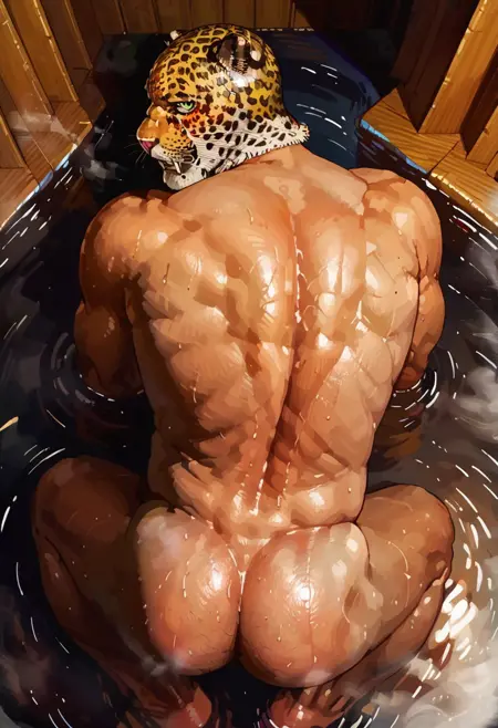 king_tekken, man, King from Tekken 7, fully body, wrestling outfit, bare chest, yellow and blue pants, yellow boots, yellow knee pads, yellow and blue fingerless gloves, yellow elbow pads, tail, bara