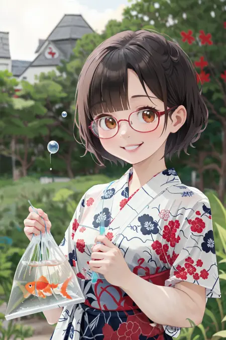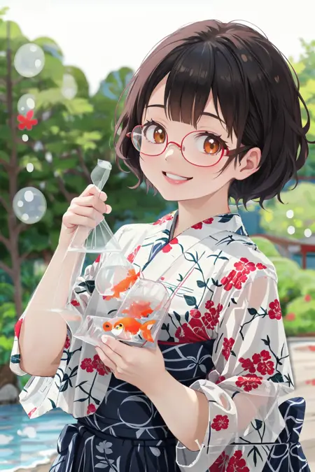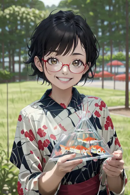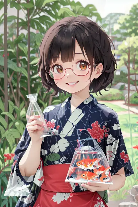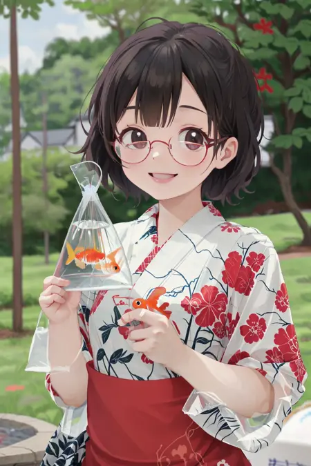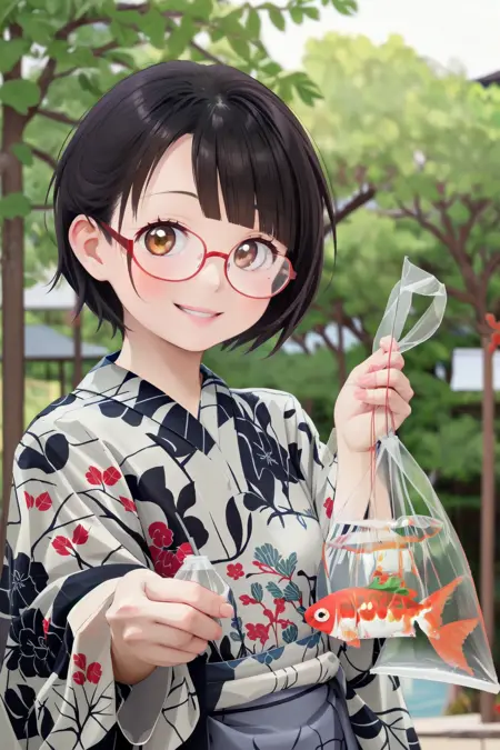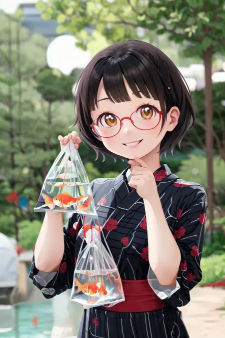 이는 일본의 시장에서 흔히 볼 수 있는 '금붕어 사기'에서 금붕어를 잡아 집에 가져올 때 사용하는 '금붕어 봉투'의 풍경을 묘사할 수 있는 LoRA입니다.