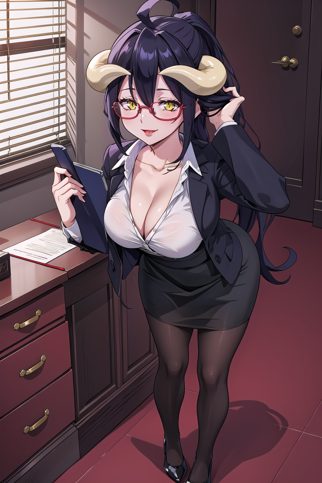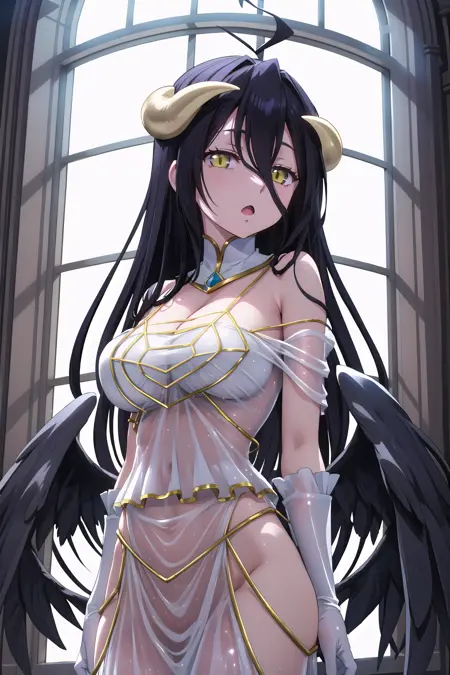 Tags: ahoge, black_hair, yellow_eyes, hair_between_eyes, slit_pupils, demon_horns, black_demon_wings, low_wings