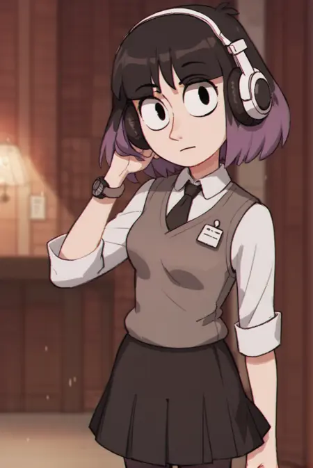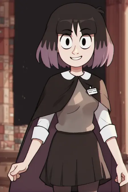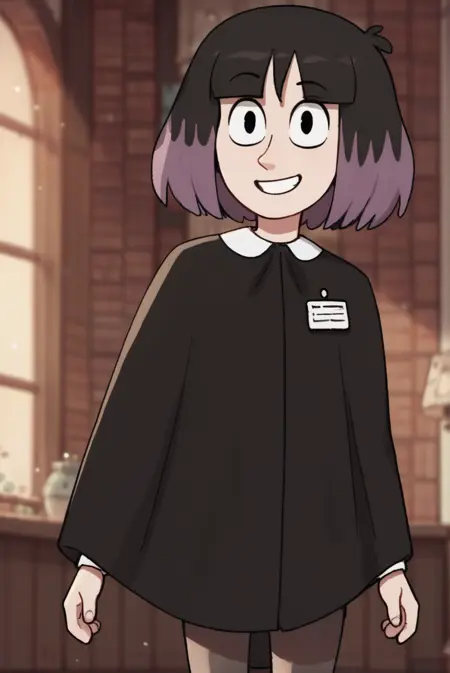 Black cloak, open cloak, grey vest, white shirt, pantyhose, black footwear, name tag