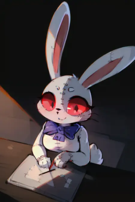 "바니, 패치워크 코스튬, 래빗 코스튬, 파란 리본"으로 프롬프트하면 상당히 빠르게 소환 가능하지만, 눈동자 부분이 다소 예측 불가능하며 일반적으로 몇 번의 생성 과정을 거쳐야 합니다. "블랙 푸푸" 추가가 약간 도움이 될 수 있습니다.