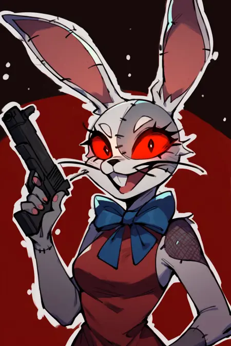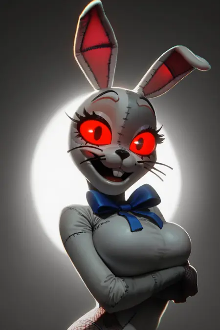 「Vanny, patchwork costume, bunny costume, blue bow」とプロンプトすると、ほぼ確実に登場しますが、瞳が少し制御しがたい傾向にあります。そのため、複数回生成を試す必要があることが多いです。「black pupils」を追加すると多少改善されるかもしれません。