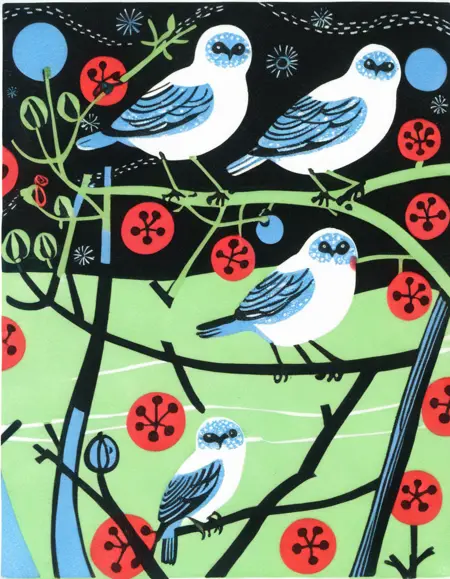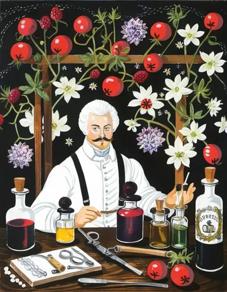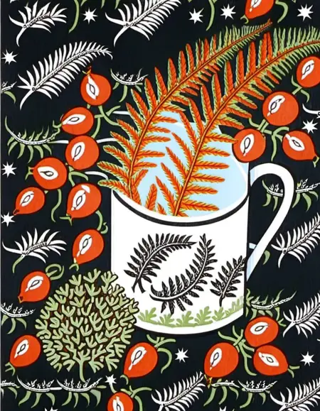 a textile pattern of a cup of tea with a fern and berries in the style of angie-lewin