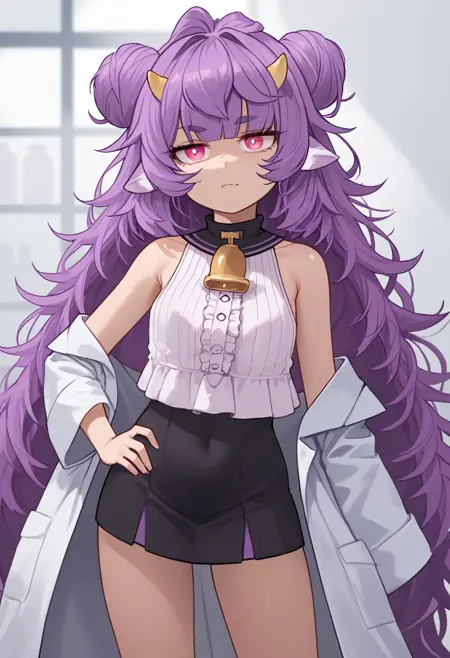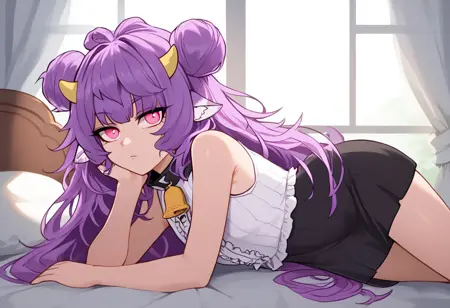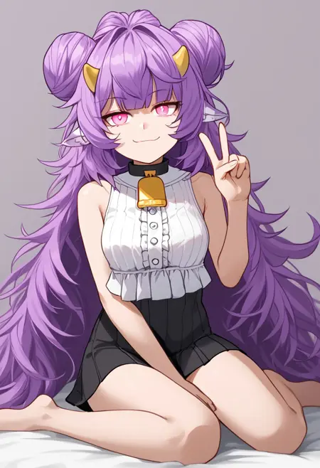 頭: 紫色の髪、長い髪、髪の結び目、動物の耳、二重の結び目、角、非常に長い髪、ピンクの目、前髪