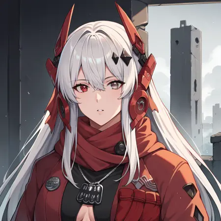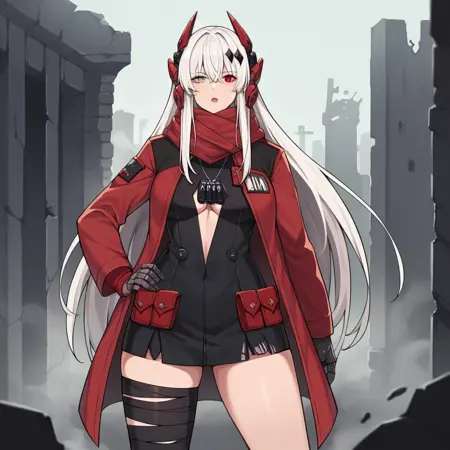 AlphaPGR, Aph_Def, long hair, white hair, alpha:_crimson_abyss_(pgr), red eyes, grey eyes, heterochromia, black dress, short dress, red pouch, center opening, dog tags, red scarf, double-breasted, torn jacket, red sleeves, gradient sleeves, sleeves past elbows, red jacket, gradient jacket, single thighhigh, red headgear, o-ring, mechanical gloves, mismatched gloves, elbow gloves, two-tone gloves, black hairclip, bandaged leg, asymmetrical legwear, center cutout, clothing cutout, black footwear, ankle boots, cross-laced footwear,