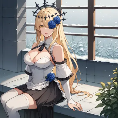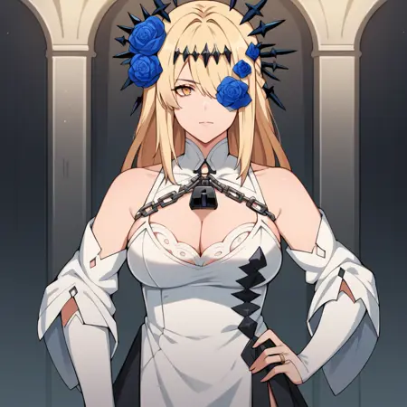 AlphaPGR, Aph_Flw, blonde hair, orange eyes, low-braided long hair, flower over eye, one eye covered, hair ornament, blue rose, flower hair ornament, single horn, bare shoulders, wrist flower, sleeveless dress, cleavage cutout, white dress, layered dress, black skirt, skirt under dress, lace, underbust, strap, stole, chain necklace, lock, see-through cleavage, blue necktie, silver jewelry, white gorget, white arm warmers, detached sleeves, frilled sleeves, white sleeves, short sleeves, lace arm warmers, single leg pantyhose, lace pantyhose, white pantyhose, mismatched legwear, asymmetrical legwear, single mechanical leg, white mechanical legs, white footwear, high heel boots,