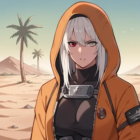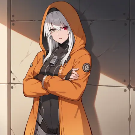AlphaPGR, Aph_Dst, long hair, white hair, hood up, black leotard, sleeveless turtleneck leotard, brown bodysuit, bodysuit, red eyes, grey eyes, armored collar, heterochromia, gradient hood, orange coat, hooded coat, open coat, puffy long sleeves, orange sleeves, partially fingerless gloves, black gloves, mechanical legs, multiple thigh straps, knee pads,