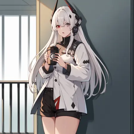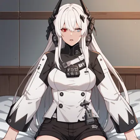 AlphaPGR, Aph_Alt, long hair, white hair, white shirt, torn shirt, black headgear, black hairclip, red eyes, grey eyes, heterochromia, dog tags, black trim, collared shirt, black collar, multicolored shirt, grey shirt, long sleeves, wide sleeves, two-tone gloves, mismatched gloves, mechanical gloves, elbow gloves, black shorts, white belt, short shorts,