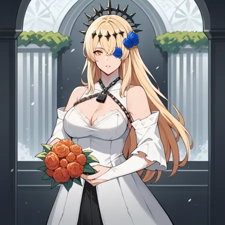 Alp_White, blonde hair, long hair, orange eye, flower over eye, one eye covered, blue rose, white dress, white skirt, black skirt, double layered skirt, thorns, white thighhighs, black frills, chains, lock, detached sleeves, short sleeves, bare shoulders, bridal gauntlets, cleavage, hair flower, crown,