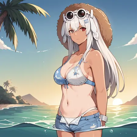 Alp_Swimsuit, blue bikini, blue shorts, string bikini, short shorts, tan, tanlines, white bikini, eyewear on head, sunglasses, floppy ears, bunny ears, jewelry, bracelet, hairclip, navel, straw hat, sun hat,