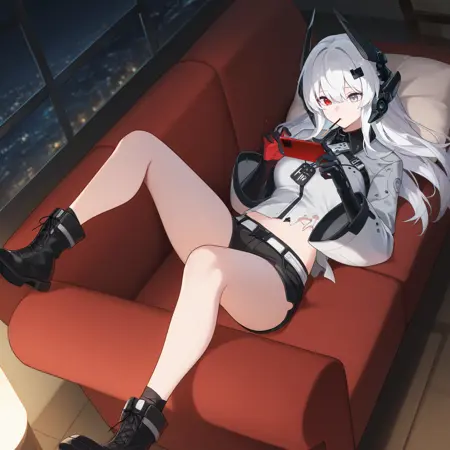 AlphaPGR, Aph_Alt, long hair, white hair, white shirt, torn shirt, black headgear, black hairclip, red eyes, grey eyes, heterochromia, dog tags, black trim, collared shirt, black collar, multicolored shirt, grey shirt, long sleeves, wide sleeves, two-tone gloves, mismatched gloves, mechanical gloves, elbow gloves, black shorts, white belt, short shorts,