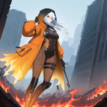 AlphaPGR, Aph_Dst, long hair, white hair, hood up, black leotard, sleeveless turtleneck leotard, brown bodysuit, bodysuit, red eyes, grey eyes, armored collar, heterochromia, gradient hood, orange coat, hooded coat, open coat, puffy long sleeves, orange sleeves, partially fingerless gloves, black gloves, mechanical legs, multiple thigh straps, knee pads,