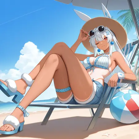 AlphaPGR, Aph_Swm, long hair, white hair, red eyes, grey eyes, fur-trimmed sandals, light blue footwear, ankle strap, heterochromia, low-tied long hair, frilled bikini, white chain, pin, goggles, dark-skinned female, denim shorts, starfish, white bikini, striped bikini, beachball, front-tie bikini top, tanlines, tan, flower, light blue hairclip, light blue earrings, light blue shorts, rabbit ears, open shorts, bikini under shorts, fur thigh strap, fur trim, sun hat, fake animal ears, brown headwear, fur-trimmed headwear, sunglasses, eyewear on head, glasses, tinted eyewear, wristband,