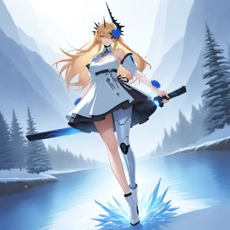 AlphaPGR, Aph_Flw, blonde hair, orange eyes, low-braided long hair, flower over eye, one eye covered, hair ornament, blue rose, flower hair ornament, single horn, bare shoulders, wrist flower, sleeveless dress, cleavage cutout, white dress, layered dress, black skirt, skirt under dress, lace, underbust, strap, stole, chain necklace, lock, see-through cleavage, blue necktie, silver jewelry, white gorget, white arm warmers, detached sleeves, frilled sleeves, white sleeves, short sleeves, lace arm warmers, single leg pantyhose, lace pantyhose, white pantyhose, mismatched legwear, asymmetrical legwear, single mechanical leg, white mechanical legs, white footwear, high heel boots,