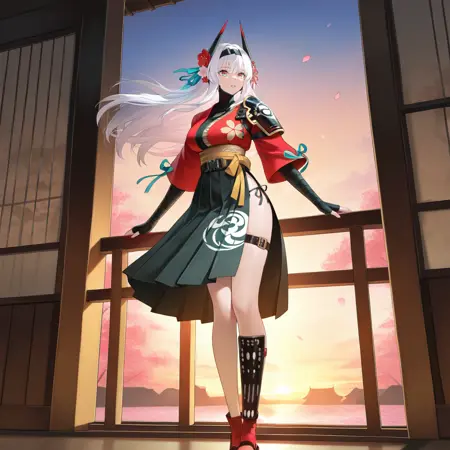 AlphaPGR, Aph_JP, long hair, white hair, japanese clothes, gradient eyes, hair flower, horns, black hairband, hair ribbon, hakama, black hakama, pleated skirt, black skirt, side-tie panties, side slit, black underwear, asymmetrical clothes, skirt print, red shirt, black undershirt, turtleneck shirt, single pauldron, shoulder armor, red sleeves, short over long sleeves, teal ribbon, sleeve ribbon, wrist guards, fingerless gloves, black gloves, yellow sash, yellow rope, black belt, buckle, thigh belt, thigh strap, single knee pad,