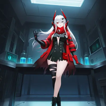 AlphaPGR, Aph_Def, long hair, white hair, alpha:_crimson_abyss_(pgr), red eyes, grey eyes, heterochromia, black dress, short dress, red pouch, center opening, dog tags, red scarf, double-breasted, torn jacket, red sleeves, gradient sleeves, sleeves past elbows, red jacket, gradient jacket, single thighhigh, red headgear, o-ring, mechanical gloves, mismatched gloves, elbow gloves, two-tone gloves, black hairclip, bandaged leg, asymmetrical legwear, center cutout, clothing cutout, black footwear, ankle boots, cross-laced footwear,