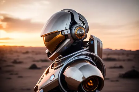 "+dvMech style, sleek body armor, mecha soldier, portrait, 85mm, f1.8, close up, photo realistic, desert military base background, soft morning lighting, shadows, subtle details, diffusion, highlight blooming, low contrast, desaturated"